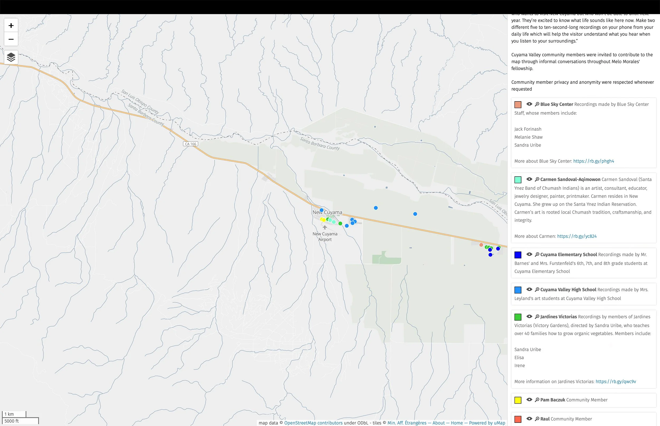 In the spring of 2023, I was the Community Action Fellow at Blue Sky Center in New Cuyama, California, a community of six hundred people in southern California. Over half of its population is Hispanic and comprised of families in which one or both parents are migrant laborers working in agriculture. In New Cuyama, I conducted sound workshops exploring listening practices and field recording techniques for mobile phones at Cuyama Elementary School, Cuyama Valley High School, with local adults, and with the grassroots land-stewarding organization Jardínes Victoria (Victory Gardens). As a first-generation and bilingual artist, the son of Colombian immigrants, my goal included providing a context for the Cuyama Valley students and surrounding community to author and uncover previously unlinked sonic territories independent of commercial or socio-political interests. Teaching myself a free and open-source mapping software during the fellowship, I concluded the fellowship by publishing an online and interactive sound-map whose sounds were populated by audio recordings the community made on their phones.